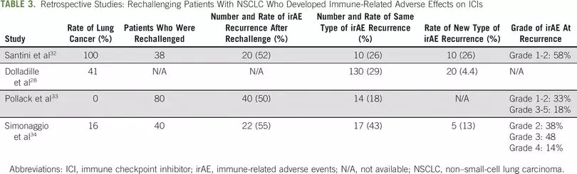 尽管大多数irAE为轻中度且ICI停用后消退,但ICI治疗相关irAE仍可带来风险。在一项研究中,38名NSCLC患者因irAE停药后再次接受ICI治疗。约一半患者没有出现任何irAE复发,大约1/4患者再次ICI挑战后出现过去相同的irAE。一项回顾性研究有类似的发现,在大约29%患者中,导致第一次ICI停药的irAE再次出现。