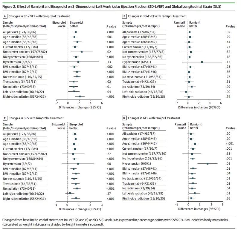 为确定正在接受蒽环类化疗的乳腺癌患者药物心血管预防是否可以减少亚临床心脏损伤,研究者发起了SAFE研究。该研究是一项4组随机双盲安慰剂对照的全国多中心Ⅲ期研究。2015年7月~2020年6月,研究者在意大利的8个肿瘤科招募了174名患者(年龄24~75岁,中位年龄48岁),研究按1∶1∶1∶1的比例随机分为四组:安慰剂组42例、雷米普利组43例、比索洛尔组45例、雷米普利+比索洛尔组43例。从化疗开始或到曲妥珠单抗治疗结束,给予心脏保护治疗12个月。在12个月时完成心脏评估患者的预先指定的中期分析。通过三维(3D)和斑点跟踪心脏超声心动图对非转移性乳腺癌患者的亚临床心功能障碍进行评估。