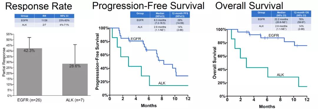 这项小样本研究共纳入33例,EGFR+和ALK+的患者分别为26例和7例。这一治疗策略展示了一定的疗效,EGFR+和ALK+患者的ORR分别为42%和29%。总体PFS为7.3个月,12个月PFS率为26%,中位OS为20.6个月,12个月OS率为61%。其中,EGFR突变的26例患者,中位PFS为8.3个月,12月PFS率29%,中位OS位22.2个月,12个月OS率76%。值得注意的是,研究中EGFR+患者治疗后OS较长,可能和免疫治疗的“拖尾”效应有关。但是,7例ALK阳性的患者,中位PFS仅2.9个月,12个月PFS率为14%,中位OS为2.9个月,12个月OS率14%,疗效尚不理想。