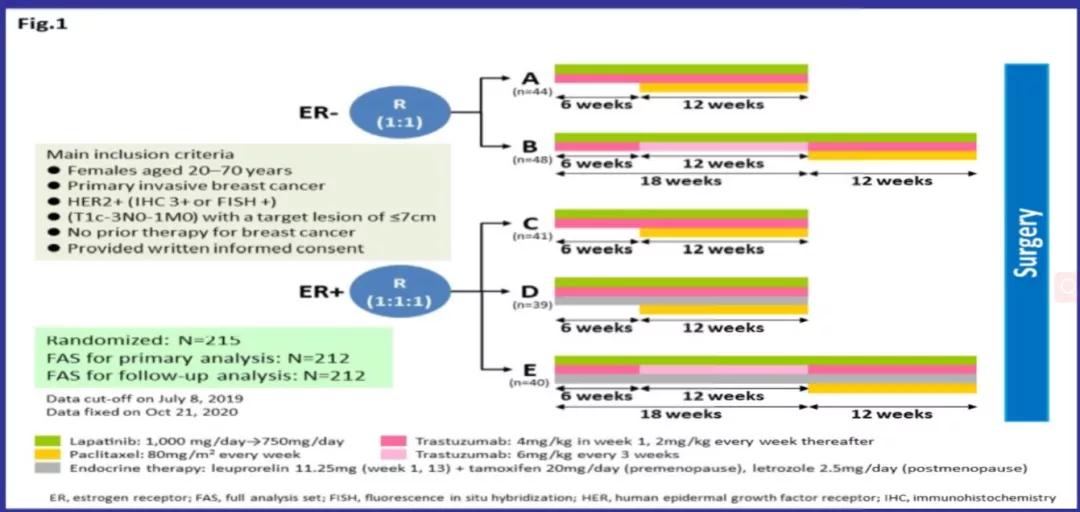 该随机Ⅱ期5组研究于2012年3月至2013年9月在日本的16个中心进行,以评估拉帕替尼+曲妥珠单抗(6 w)治疗后序贯拉帕替尼+曲妥珠单抗+每周紫杉醇(12 w)化疗前加/不加延长抗HER2治疗(18 vs. 6w)的有效性和安全性,和HER2+/ER+原发性乳腺癌患者联合/不联合内分泌治疗的疗效和安全性。
