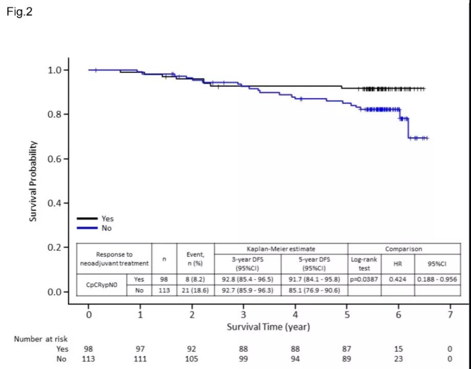 在212例随访患者中(患者特征见表1),5年无病生存率(DFS)为87.8%(95%Cl:82.5~91.6);新辅助治疗后获得CpCRypN0的患者比未获得CpCRypN0的患者更高(91.7% vs 85.1%;P=0.0387)(图2)。