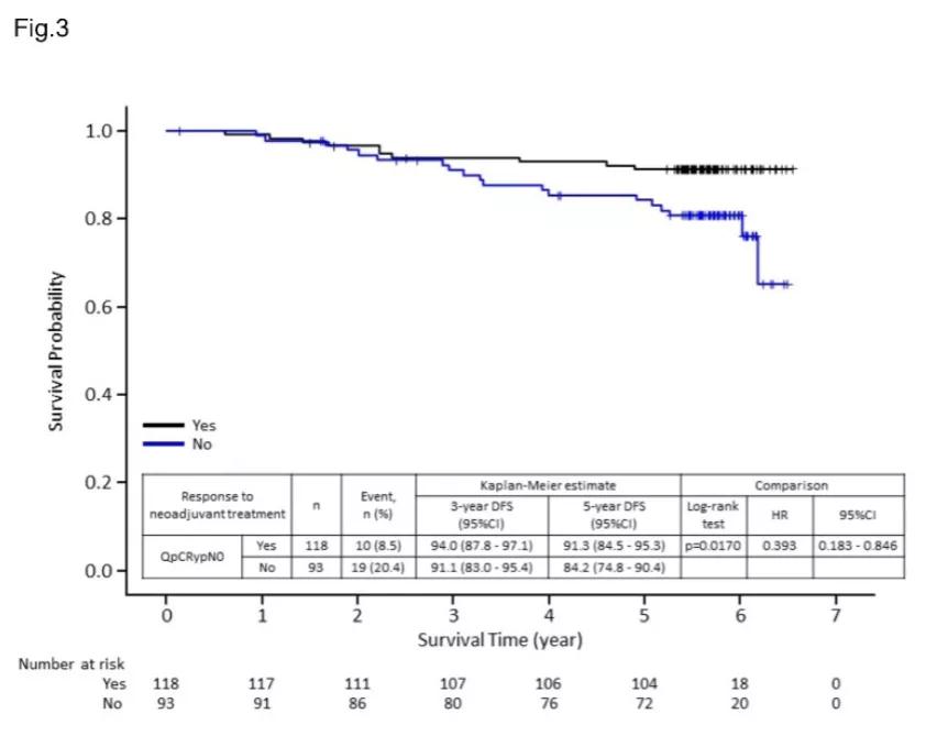 达到QpCRypN0(CpCRypN0 + near pCR)的患者5年DFS率高于未达到QpCRypN0的患者(91.3 vs 84.2;P=0.0170)(图3)。