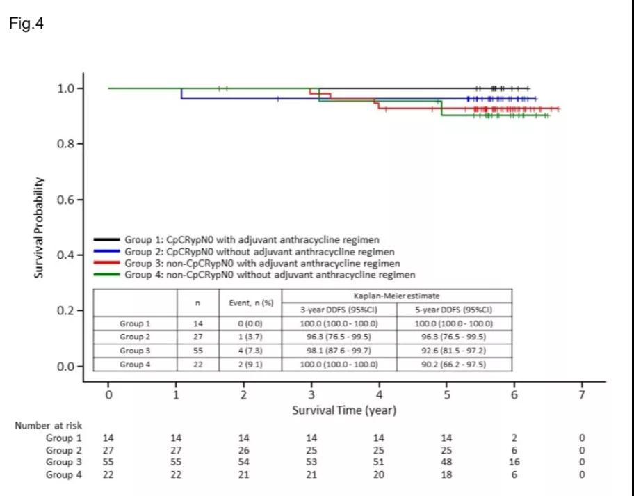 48.6%(102/210)的患者进行了基于蒽环类的新辅助治疗;有/没有接受蒽环类药物治疗患者的5年dDFS相似。在ER+队列中,5年dDFS率在90%~93%之间(图4)。