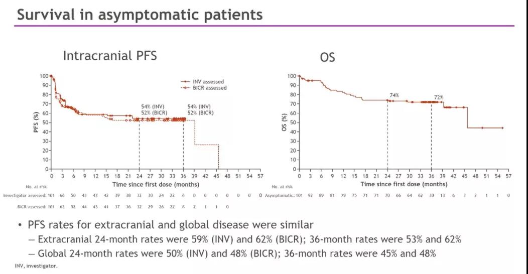 在队列A(无脑转移症状组,n=101)中,INV(研究者)和BICR(独立中心)评估的36个月PFS率分别为54%(95%CI:43~64)和52%(95%CI:41~62),3总生存率(OS)为72%(95%CI:62~80),ORR为54%(INV)和50%(BICR)。