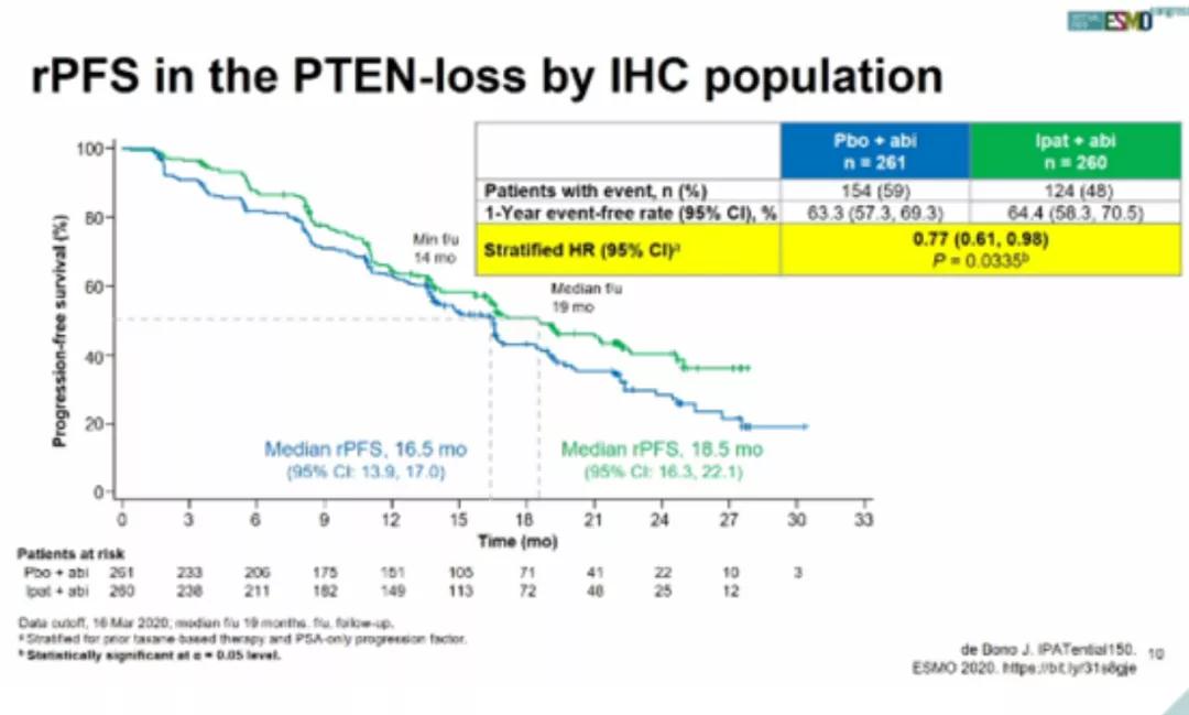 IPATential150是第一个AKTi联合ARi的III期试验(n=1101)。去年ESMO全体大会上报告的中位随访19个月结果显示,相较于安慰剂+阿比特龙(pbo+abi),Ipatasertib+阿比特龙(ipat+abi)可使PTEN缺失mCRPC患者影像学进展或死亡风险降低23%(18.5 vs 16.5个月,HR=0.77,P=0.335)。