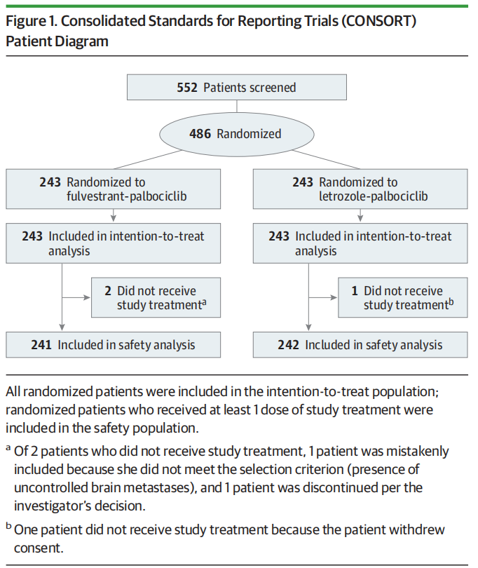 在2015年7月30日至2018年1月8日期间,486名女性(中位年龄63岁[范围:25-90岁])被随机分配到氟维司群+哌柏西利组(n=243)或来曲唑+哌柏西利组(n=243)。截止到2020年1月31日,达到PFS事件的目标数量(n=256)。共有483例患者接受了至少1剂研究治疗;3例患者由于某些原因而没有开始研究治疗(图1)。