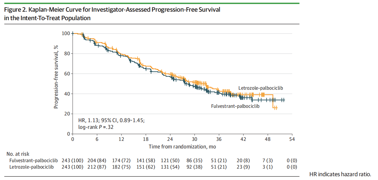 最终分析发生在256次PFS事件之后(氟维司群+哌柏西利组为131次[53.9%],来曲唑+哌柏西利组为125次[51.4%])。中位随访时间为32个月(IQR为24.2~39.7个月),中位PFS在氟维司群+哌柏西利组为27.9个月(95% CI:24.2~33.1个月),而来曲唑+哌柏西利组为32.8个月(95% CI:25.8~35.9个月)(HR=1.13;95%CI:0.89~1.45;P=0.32),两组间无显著差异(图2)。
