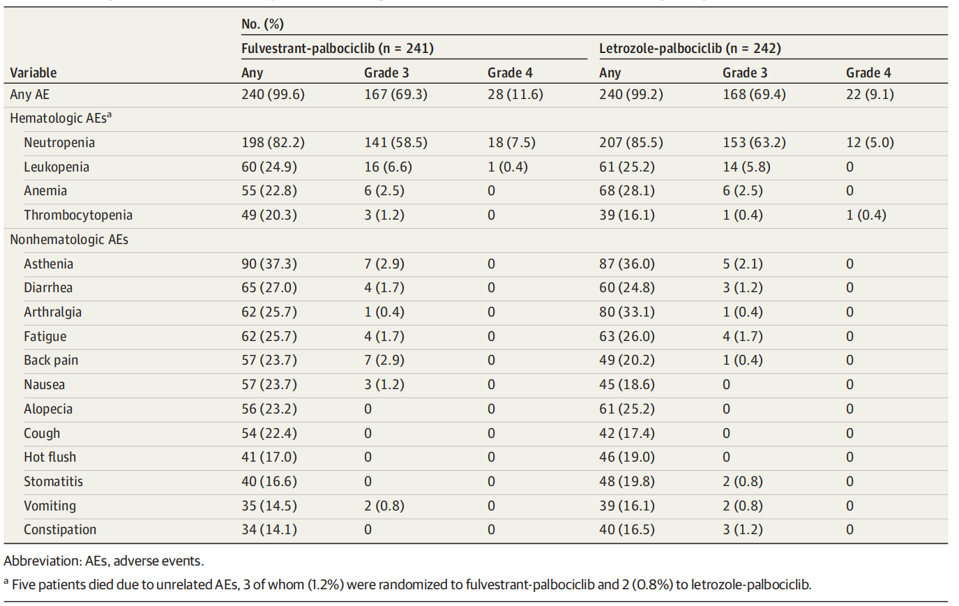 两治疗组3或4级毒性和严重AEs发生率相似(氟维司群+哌柏西利组 vs 来曲唑+哌柏西利组3或4级AEs分别为80.9%和78.5%,严重AEs分别为29.9%和21.1%)。未发现新的安全性信号。未报告治疗相关死亡。