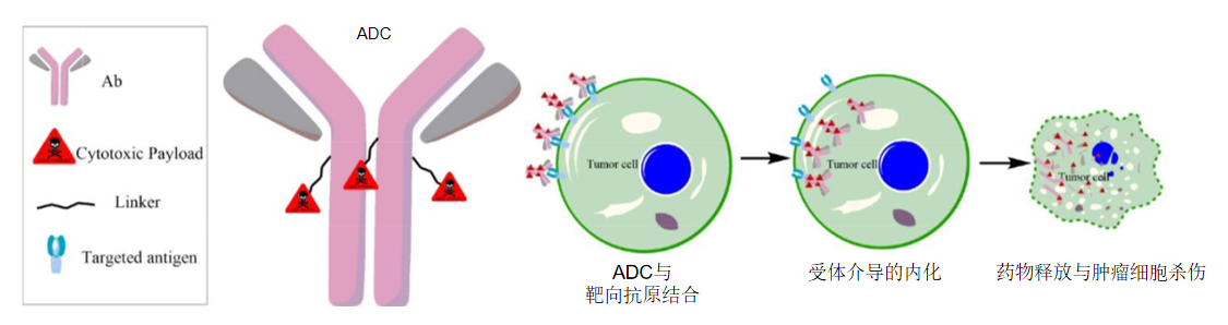ADC药物是抗体药物偶联物,是将单独的抗体通过连接子与小分子细胞毒药物(也称之为载药)偶联形成的复合物。ADC药物进入血液后,其抗体成分特异性结合肿瘤细胞表面抗原,形成ADC-抗原复合物通过内吞作用进入到细胞内,在溶酶体酶降解作用或酸性环境下释放细胞毒药物,通过破坏DNA或阻止肿瘤细胞分裂等机制起到杀死细胞的作用。此外,新型ADC药物依靠小分子载药的膜通透性,通过被动运输或非特异性胞吞与FcRn受体结合并被转运出细胞,杀死临近癌细胞,发挥“旁观者效应”。ADC药物直接靶向肿瘤细胞,极大地降低化疗药物对其他正常细胞的毒副反应,从而减少全身不良事件发生。