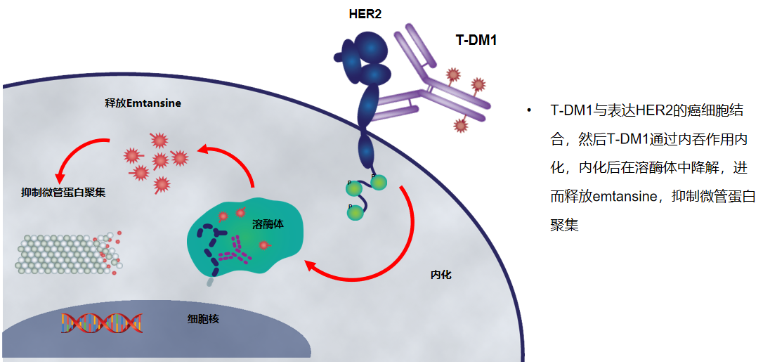 T-DM1。曲妥珠单抗-美坦新偶联物( Trastuzumab emtansine,T-DM1) 由曲妥珠单抗和细胞 毒性药物美坦新(DM1) 通过不可裂解的硫醚连接物偶联而成。微管蛋白是细胞分裂所必需的,DM1是微管蛋白聚合的一种有效抑制剂,其抑制微管蛋白聚合,进而抑制细胞分裂,导致细胞凋亡。