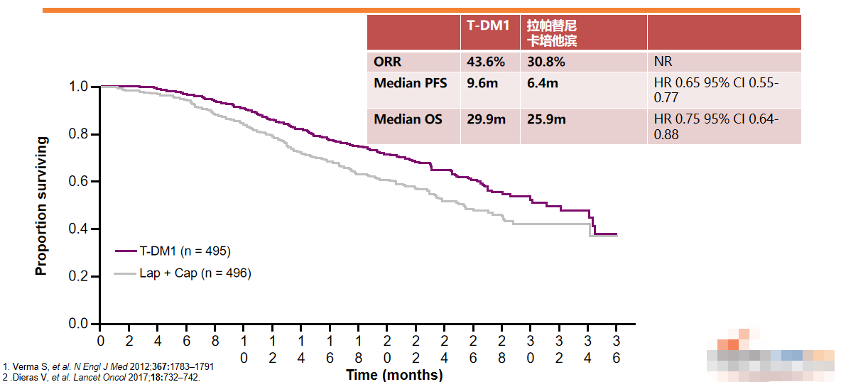 T-DM1是全球首个、唯一在中国获批治疗乳腺癌的ADC药物。EMILIA研究结果显示T-DM1较卡培他滨+拉帕替尼明显改善无进展生存期(PFS)和总生存率(OS),奠定其在HER2+晚期乳腺癌二线治疗的标准地位。2021年ESMO会议中,EMILIA研究最终结果显示T-DM1在既往接受过HER2+晚期乳腺癌亚洲人群的数据,PFS 9.3个月和OS 34.3个月,与全球人群的数据基本类似,再次证明T-DM1可以为HER2+晚期乳腺癌二线治疗带来希望。