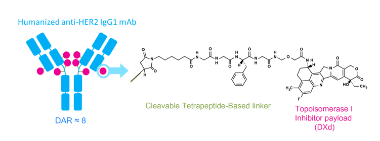 T-DXd。Trastuzumab Deruxtecan(DS-8201)是继T-DM1之后新一代ADC药物,在高活性的拓扑异构酶Ⅰ抑制剂DXd作为有效载荷,避免微管蛋白抑制剂继发性耐药,基于四肽的可裂解连接子稳定性高,采用半胱氨酸偶联,药物抗体比(DAR)达到8,大大增强抗肿瘤效力。此外,脱氨化设计的DXd能跨膜进入邻近肿瘤细胞,发挥旁观者效应,从而杀伤更多肿瘤细胞。