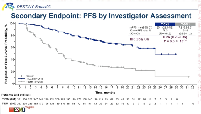2021年ESMO大会中,全世界肿瘤学者再一次将目光聚焦在“魔法子弹”—T-DXd。DESTINY-Breast03研究在既往接受过曲妥珠单抗或者紫杉类药物治疗的二线及二线以上HER2阳性晚期乳腺癌对比T-DXd和T-DM1疗效及安全性,结果显示T-DXd组获得迄今为止乳腺癌二线治疗最长的PFS 25.1个月vs T-DM1组7.2个月(HR=0.27)。