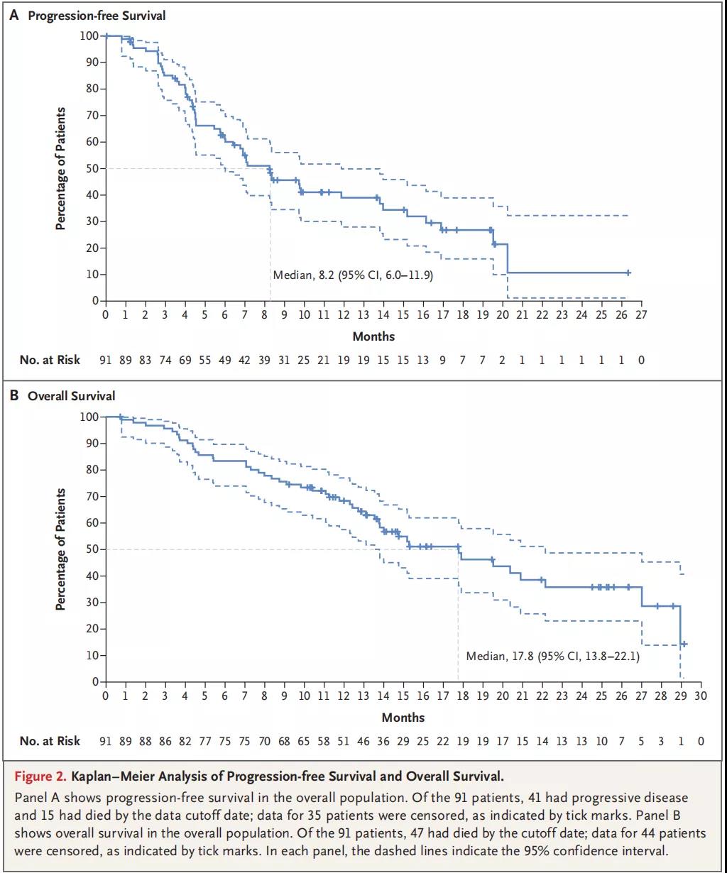 在91例接受治疗的患者中,50例(55%;95%CI:44~65)经证实获得客观缓解。1例患者(1%)获得了经证实的完全缓解,49例患者(54%)获得了证实的部分缓解(表2)。大多数患者(95%CI:85~97)疾病得到控制,肿瘤体积减小(图1A)。在既往接受多种癌症治疗(包括免疫治疗)的患者和基线有中枢神经系统(CNS)转移的患者中也观察到应答。肿瘤大小随时间的变化如图1B所示。在33例中枢神经系统转移的患者中,14例曾接受过脑部放疗,19例未接受过放疗。在这些患者中,分别有8例和10例患者达到部分缓解。