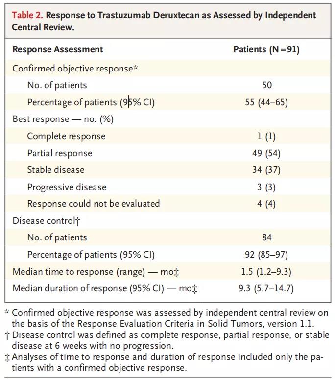 表2. 经独立中心评估的患者对T-DXd治疗的反应