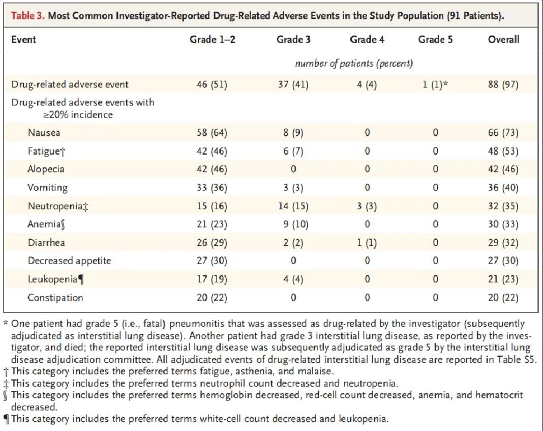 接受治疗的91例患者都至少发生了1起不良事件,88例患者中(97%)至少发生了1起研究者报告的与T-DXd相关的不良事件。≥20%患者的发生的不良事件大多数为1级或2级;常见不良事件包括胃肠道和血液系统鼻梁反应,食欲下降和脱发。42例患者(46%)发生了3级或以上的药物相关不良事件。最常见的3级或以上的药物相关不良事件包括中性粒细胞减少症(19%)和贫血(10%)(表3)。