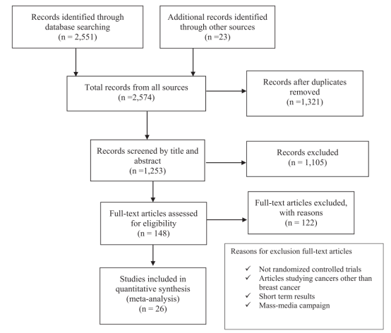 纳入的26项研究中,参与者被诊断患有不同分期的乳腺癌。所有治疗方式包括化疗、内分泌治疗和放疗。研究诊断后锻炼对乳腺癌幸存者的抑郁、生理功能和死亡率的影响。在随机对照试验中,运动的方式、强度和时间有所不同。使用流行病学研究中心抑郁量表(CES-D)、医院焦虑和抑郁量表(HADS)定义的几种预后指标来评估抑郁。为了评估死亡率,研究人员对参与者进行了1~11年的观察。大多数研究通过死亡记录/证明确认了死亡率。