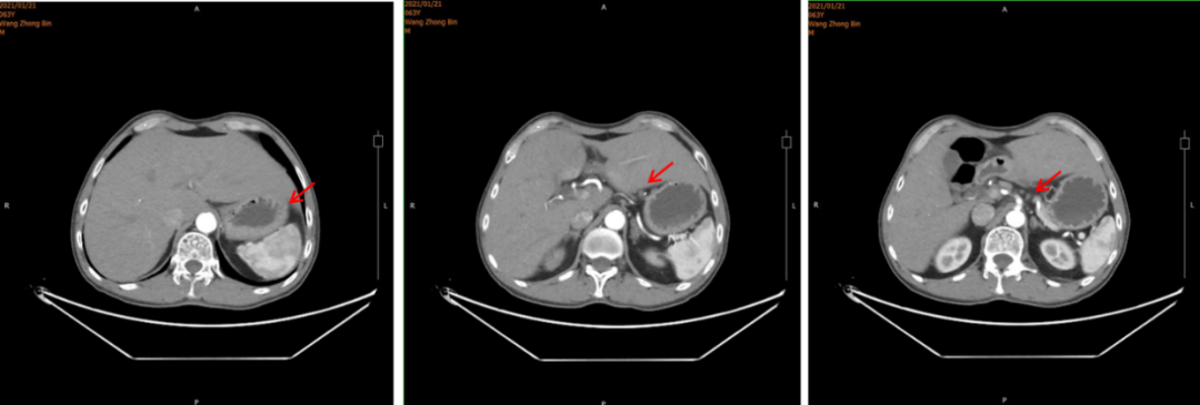 2021年1月21日腹部CT:胃窦癌征象,伴胃周、腹膜后增大淋巴结,请结合临床;肝右叶肝内胆管结石或钙化灶;左侧肾上腺强化不均。