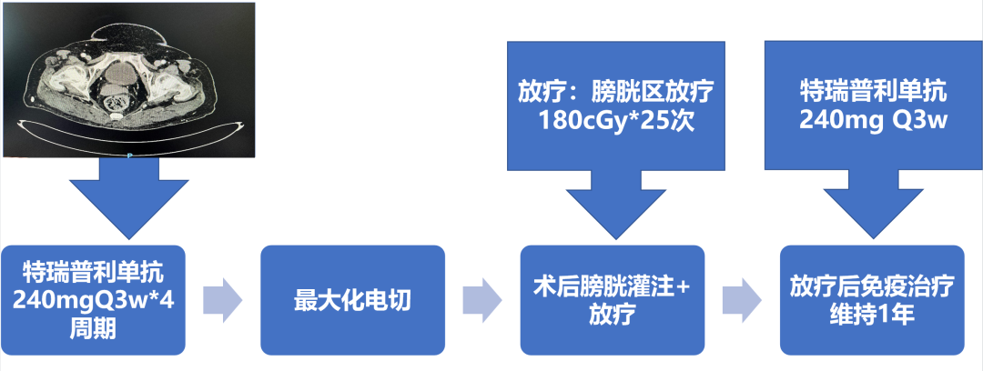 这是一例cT2期的MIBC老年患者,拒绝根治性膀胱切除术,且存在肾功能不全,不适合顺铂化疗。在“肿瘤整合诊治”理念的指导下,患者接受了特瑞普利单抗新辅助治疗、最大程度TURBt、放疗、膀胱灌注、特瑞普利单抗维持治疗等综合治疗以达到保留膀胱和长期生存的目的。该病例的诊治过程体现了以下临床价值。