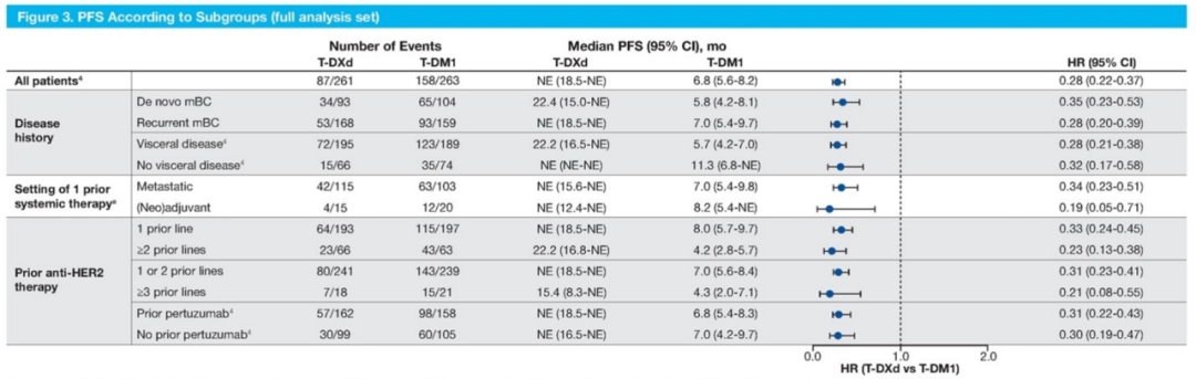 研究结果显示,所有亚组的PFS均显示出T-DXd获益(见以下森林图);新诊断和复发mBC患者的ORR与总体人群相似;不同亚组患者的TEAEs调整暴露发生率相似。值得注意的是,在35例早期进展(新辅助/辅助治疗6个月内进展,含帕妥珠单抗方案则为12个月内进展)的患者中,T-DXd治疗患者的疾病进展风险降低81%(HR 0.19,95%CI:0.05~0.71),把T-DXd作为此类患者的晚期初始治疗,PFS获益幅度非常明显。