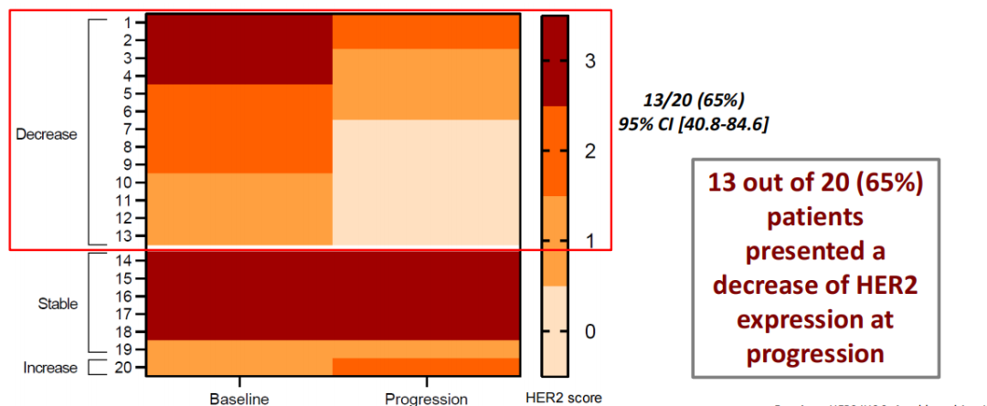 尽管HER2的表达随着T-DXd的治疗进展而下降,但没有强有力的证据表明T-DXd的摄取是发生耐药的主要机制。疾病进展时,在4/6例患者中观察到T-DXd分布,其中2例患者观察到HER2表达水平的下降。