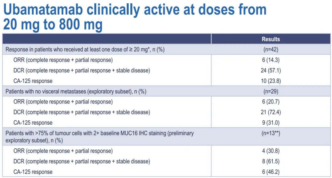 研究结果显示,接受至少1剂≥20 mg ubamatamab的患者(n=42)的ORR为14.3%,疾病控制率(DCR)为57.1%。此外,23.8%的患者发生CA-125反应。
