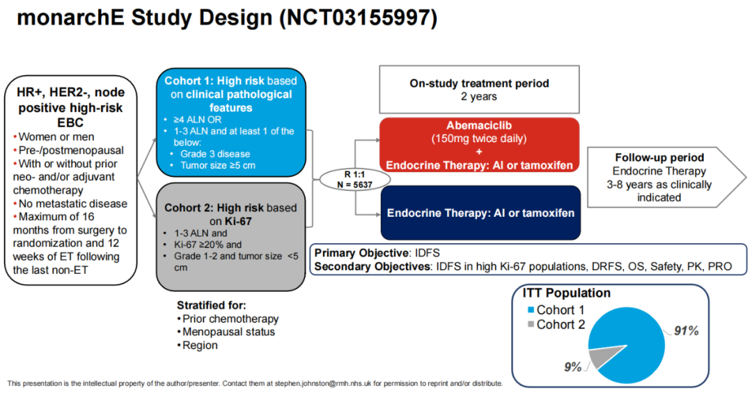 张聚良教授:monarchE是一项随机、开放标签的多中心Ⅲ期临床研究,旨在比较阿贝西利+标准内分泌治疗和单药标准内分泌治疗对于HR+/HER2-高危早期乳腺癌患者的疗效和安全性。该研究自2017年7月~2019年8月共从38个国家600多个中心选取了5637例患者,按1∶1比例分别随机至阿贝西利+标准内分泌治疗组(队列1)或单药标准内分泌治疗组(队列2)。