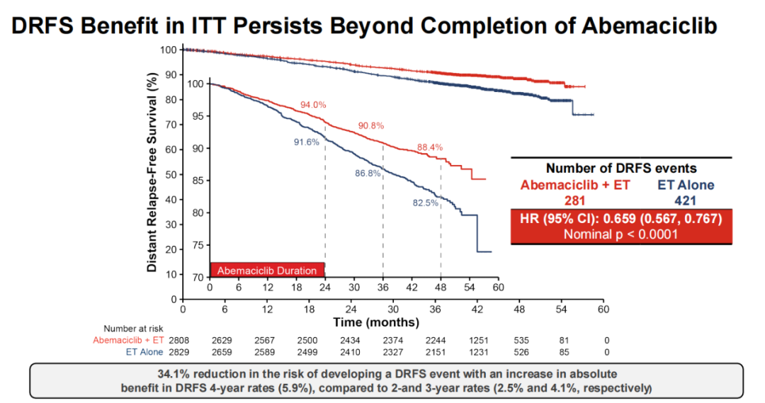 阿贝西利联合内分泌治疗组的2808例患者中的281例(10.0%)和单独内分泌治疗组的2829例患者中的421例(14.9%)发生远处无复发生存事件。阿贝西利联合内分泌治疗可降低34%的DRFS风险(HR 0.659,95%CI:0.567~0.767;P<0.0001)。阿贝西利联合内分泌治疗组估计的4年DRFS率为88.4%(95%CI 86.9~89.7),而单独内分泌治疗组为82.5%(80.7~84.1),绝对差异为5.9%,而2年时的差异为2.5%(94.0%[93.1~94.9]vs 91.6%[90.4%~92.5]),3年差异为4.1%(90.8%[89.7~91.9]vs 86.8%[85.4~88.0])。由此可见,两组患者差距也在逐渐增大。