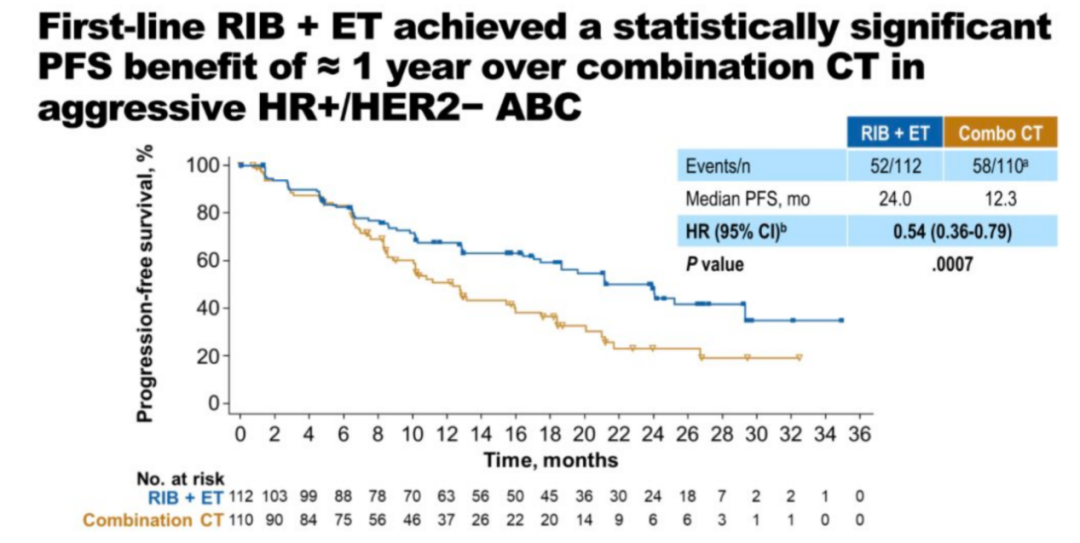 研究共入组了222例患者,两组患者的基线特征平衡。大多数患者年龄大于40岁,一半以上患者为亚裔。Ribociclib组或化疗组中分别有84.8%和86.4%的患者为ER≥50%。在侵袭性疾病特征方面,Ribociclib组与对照组分别有20.5%和16.4%为快速进展、13.4%和14.5%为症状性非内脏疾病、66.1%和69.1%为症状性内脏转移、54.5%和50.0%为内脏危象。