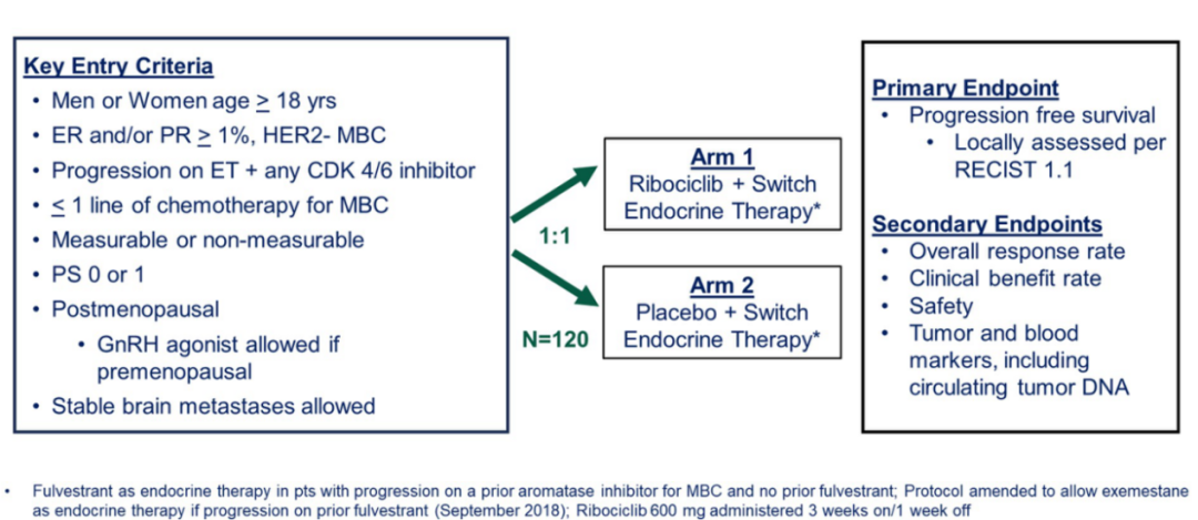 MAINTAIN研究是一项随机对照试验,研究入组对象为HR+/HER2-晚期乳腺癌患者,这些患者至少都经过一种CDK4/6抑制剂治疗和任何一种内分泌治疗后出现疾病进展。该研究共入组了120例患者,并将患者按照1∶1比例进行分配,给予内分泌联合Ribociclib治疗或内分泌联合安慰剂治疗。