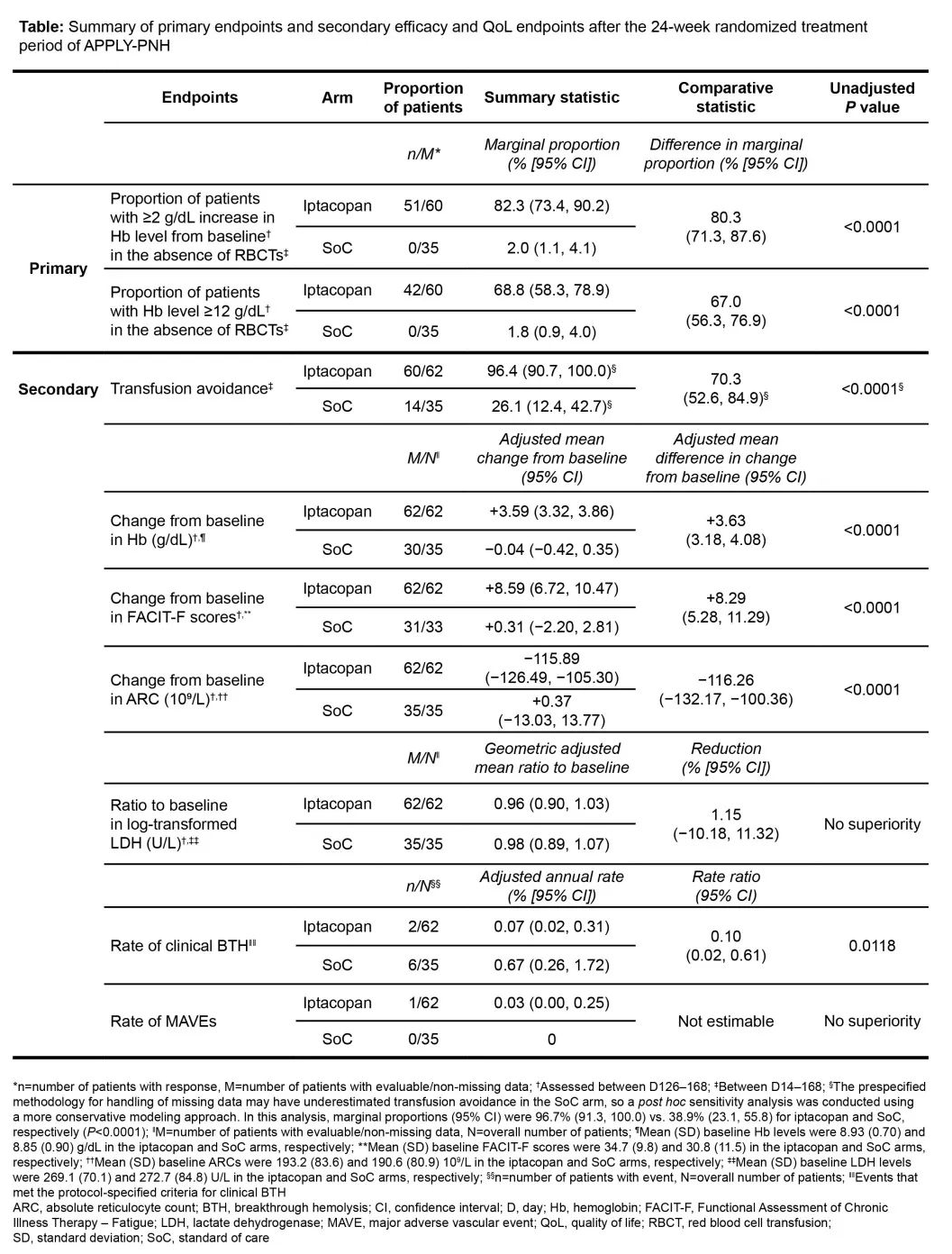Regis Peffault De Latour,Alexander Roeth,Austin Kulasekararaj,et al.Oral Monotherapy with Iptacopan,a Proximal Complement Inhibitor of Factor B,Has Superior Efficacy to Intravenous Terminal Complement Inhibition with Standard of Care Eculizumab or Ravulizumab and Favorable Safety in Patients with Paroxysmal Nocturnal Hemoglobinuria and Residual Anemia:Results from the Randomized,Active-Comparator-Controlled,Open-Label,Multicenter,Phase III APPLY-PNH Study.ASH 2022 Abstract LBA-2.