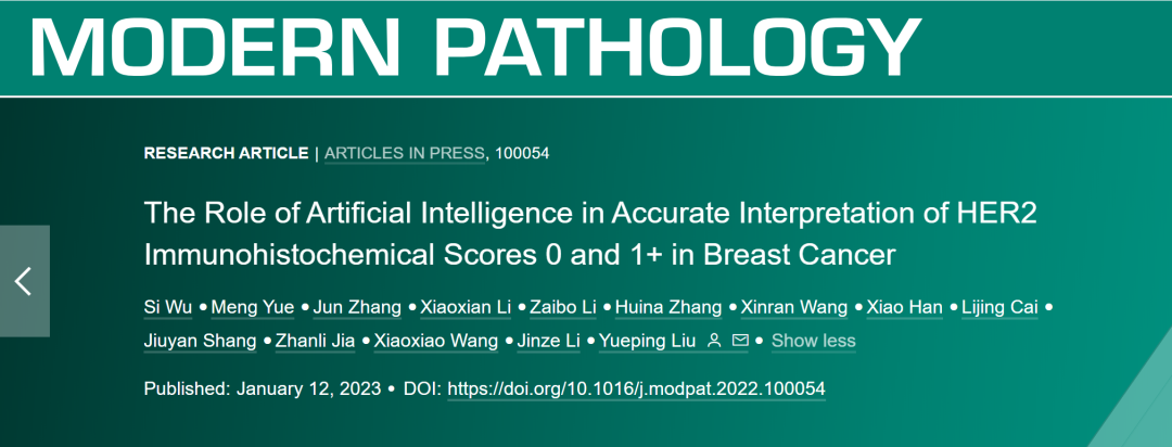 该研究成果于近期发表于美国和加拿大病理学会(USCAP)官方期刊《现代病理学》(Modern Pathology),河北医科大学第四医院病理科吴偲为第一作者(Si Wu,Meng Yue,Jun Zhang,Xiaoxian Li,Zaibo Li,Huina Zhang,Xinran Wang,Xiao Han,Lijing Cai,Jiuyan Shang,Zhanli Jia,Xiaoxiao Wang,Jinze Li,Yueping Liu.The Role of Artificial Intelligence in Accurate Interpretation of HER2 Immunohistochemical Scores 0 and 1+in Breast Cancer.Mod Pathol.2023 Jan.doi:10.1016/j.modpat.2022.100054.)