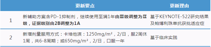 高危(LN阳性和/或>2cm)的III级推荐顺序中,AC-TP(2B)调整至前面,FEC-T证据级别由1B调整为2B;低危患者I级推荐顺序中,TC×4方案调整至前面。