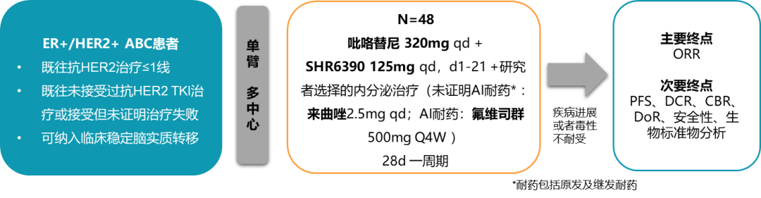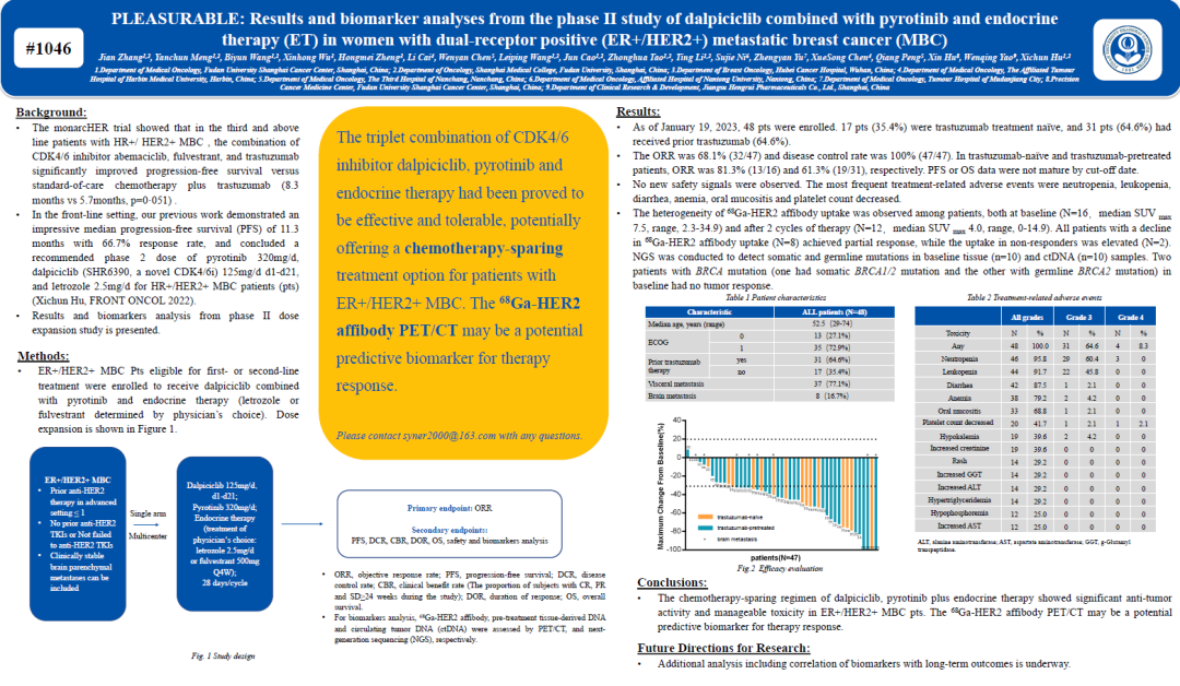 研究背景:我们前期探索了达尔西利(SHR6390,一种新型CDK4/6抑制剂)联合吡咯替尼及来曲唑在HER2和激素受体双阳性晚期乳腺癌前线患者人群中的客观缓解率达66.7%,中位无进展生存11.3个月;并得出Ⅱ期推荐给药剂量为吡咯替尼320mg/d,达尔西利125mg/d,d1-d21和来曲唑2.5mg/d(Jian Zhang&Xichun Hu,Front Oncol 2022)。此次ASCO会议介绍Ⅱ期剂量扩展研究的中期结果和生物标志物分析。