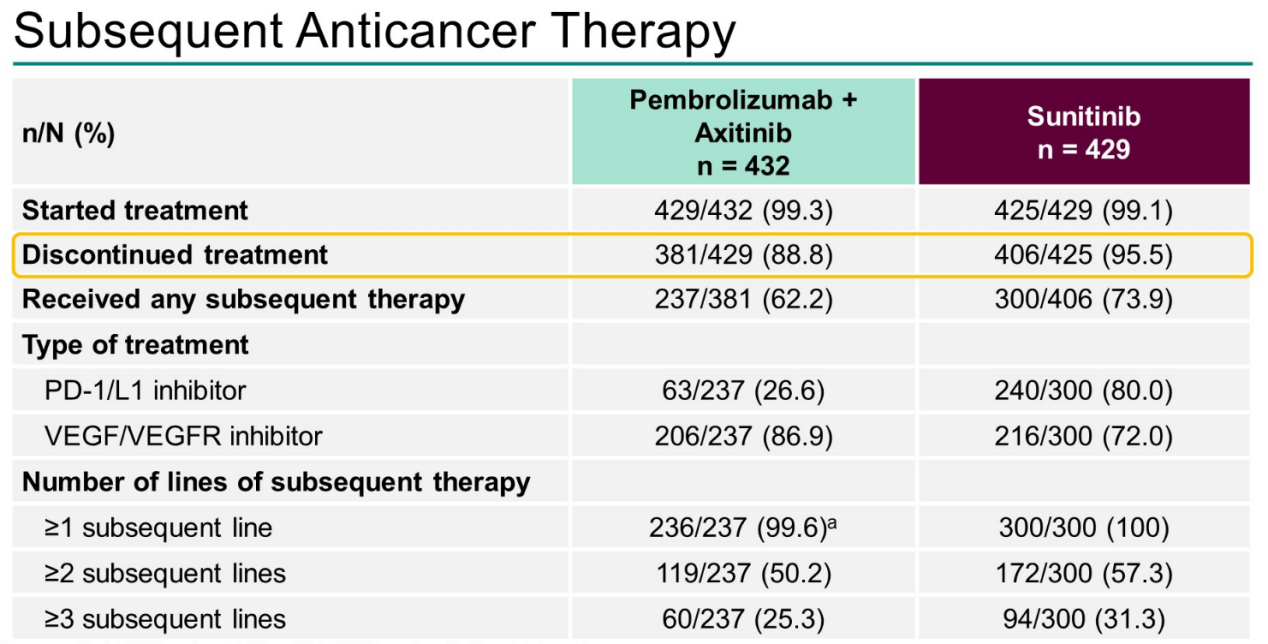 此次长期随访的数据显示,PFS、ORR和DOR等数据基本上与既往报道一致,主要在OS方面有所变化,阿昔替尼联合帕博利珠单抗治疗组的中位生存时间达到47.2个月,舒尼替尼治疗组达到40.8个月,5年OS率分别为41.9%和37.1%;相对于舒尼替尼治疗组,阿昔替尼联合帕博利珠单抗治疗具有生存获益(HR=0.84,95%CI:0.71–0.99)。无进展生存分析方面:阿昔替尼联合帕博利珠单抗治疗组达到15.7个月,舒尼替尼治疗组达到11.1个月,两组具有统计学差异(HR=0.69,95%CI:0.59–0.81)。