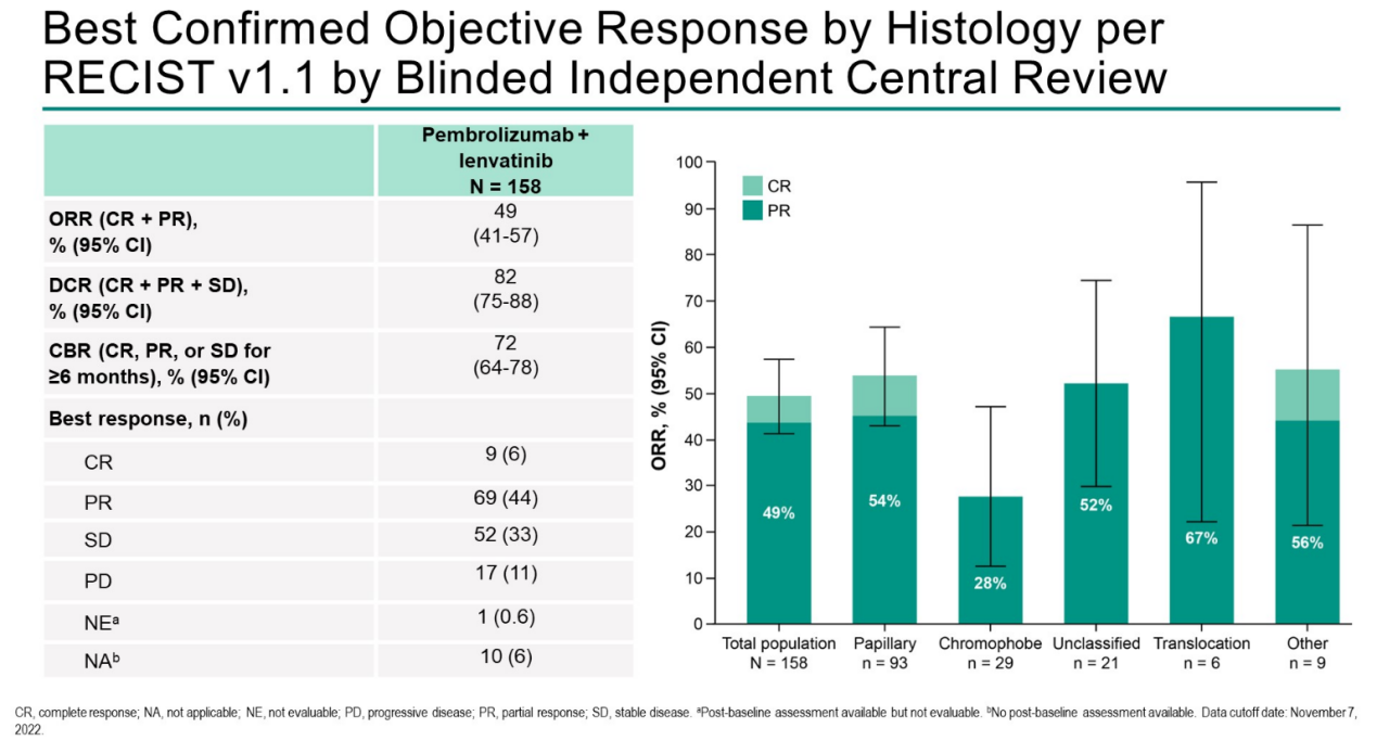此次分析的患者比上次增加了11例(n=158),中位随访时间约15个月,总体上ORR、DCR等疗效与上次分析的结果相似(见下图),ORR和DCR分别为49%和82%,且乳头状(49%)、嫌色细胞(28%)、未分类(52%)、Xp11.2易位(67%)等不同组织类型均有不错的ORR。中位PFS和OS分别为17.9个月(95%CI,13.5-NR)和NR(95%CI,NR-NR)(数据尚未成熟);1年PFS和OS分别为63%和82%。