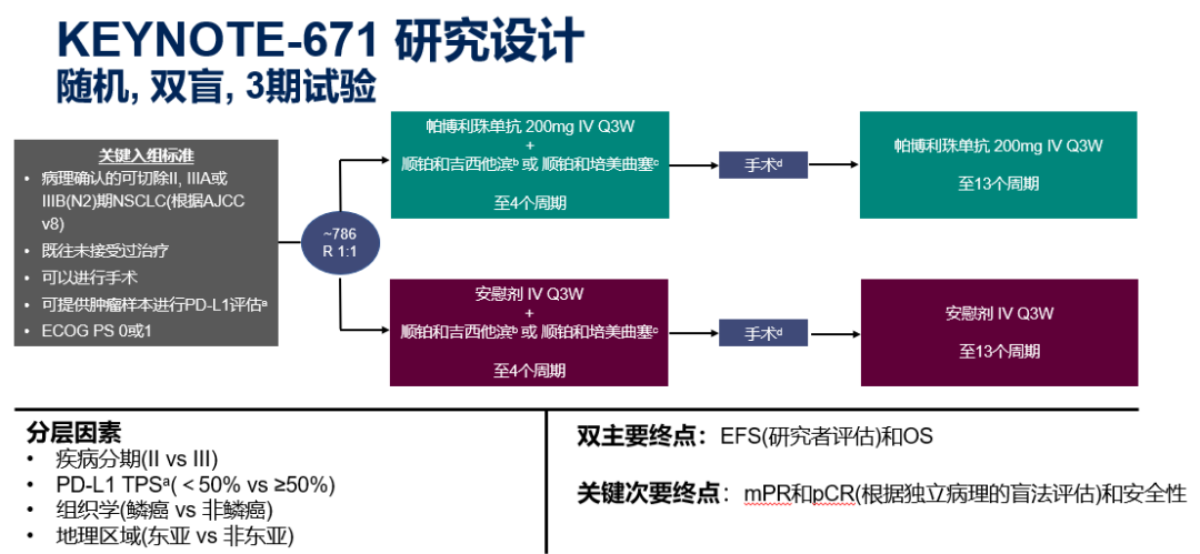 KEYNOTE-671:帕博利珠单抗或安慰剂联合含铂化疗新辅助治疗,手术后辅助帕博利珠单抗或安慰剂治疗早期NSCLC的随机、双盲、III期研究