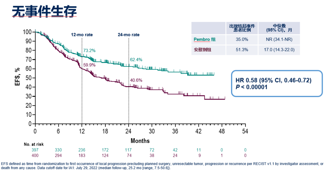 帕博利珠单抗组有80.6%(320/397)的患者接受了手术(R0切除占比92%),安慰剂组75.5%(302/400)接受手术(R0切除占比84%)。