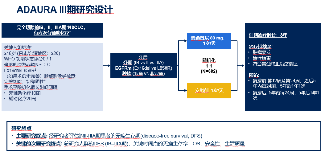 ADAURA研究是一项全球、多中心、III期双盲随机对照临床试验,旨在探索奥希替尼辅助治疗IB-IIIA期EGFR突变阳性完全切除术后NSCLC患者的疗效和安全性。682例符合条件的患者1:1比例随机分配接受奥希替尼(80mg,口服,每日一次)或安慰剂,直至出现疾病复发、满3年或符合其他终止治疗指征。主要研究终点为研究者评估的II-IIIA期患者的无病生存(DFS),次要研究终点包括IB-IIIA期患者DFS、OS及安全性和生活质量。