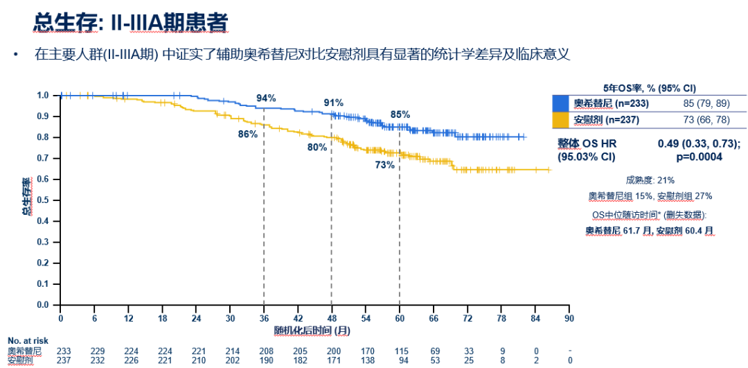 主要研究人群(II–IIIA期):奥希替尼组和安慰剂组的5年OS率分别为85%和73%(OS HR=0.49; 95.03% CI 0.33-0.73; p=0.0004)