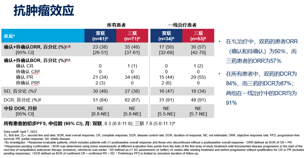 在总人群中,双药疗法的ORR为38%(95%CI:26%-51%),三药疗法的ORR为49%(95%CI:37%-61%)。