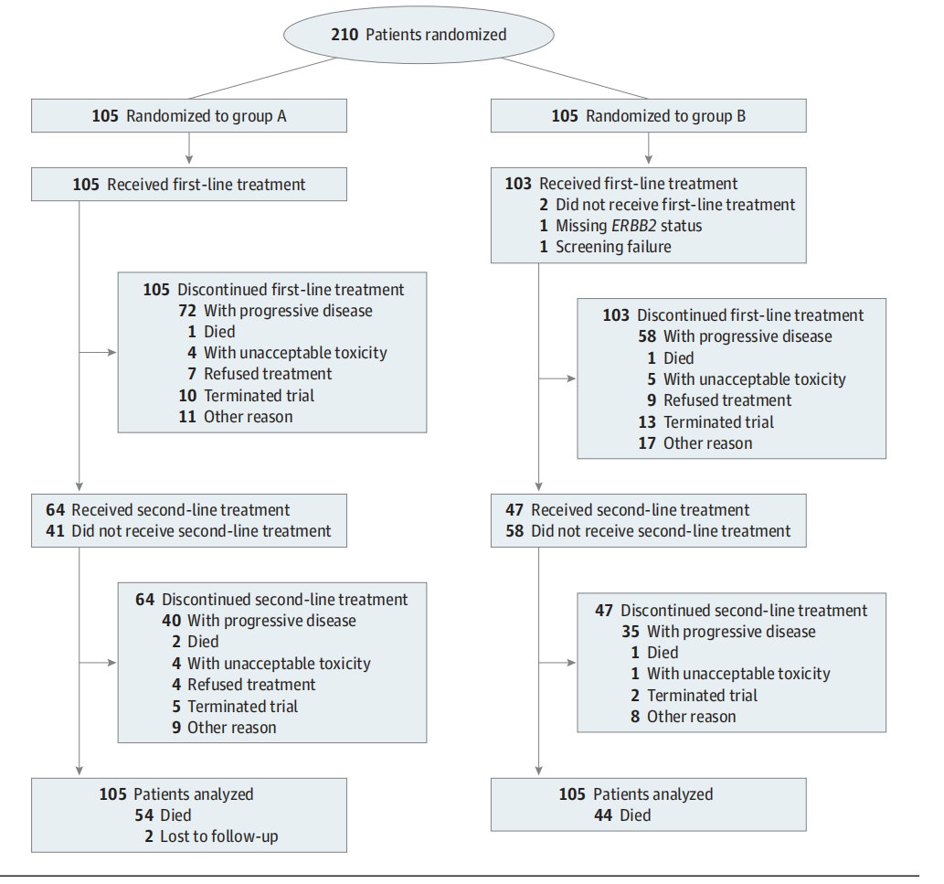 2013年5月3日至2016年1月4日,210例患者在法国27个研究中心、瑞士20个研究中心、荷兰9个研究中心和德国1个研究中心被进行随机分组。B组中的2例患者未接受任何治疗。试验截止日期为2020年5月26日,23例患者(A组10例,B组13例)仍在接受一线治疗。在继续接受二线治疗的111例患者中,7例在试验终止时仍在治疗中。共有98例患者死亡。意向治疗人群的试验流程图见图1,分析数据锁定时间为2020年12月18日。