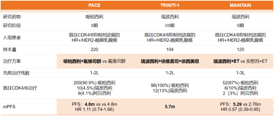 值得注意的是,即使一线治疗PFS较好的患者中,随着疗程延长也存在不少继发耐药患者,例如瑞波西利治疗12个月时的进展率为17.8%,18个月时的进展率则达37%[3]。超过三分之一的耐药比例,使得CDK4/6i跨线治疗的PFS仅为5-6个月,例如2期PACE研究中哌柏西利+氟维司群跨线治疗的中位PFS仅为4.6个月[4];2期MAINTAIN研究中瑞波西利+ET的中位PFS为5.29个月[5]