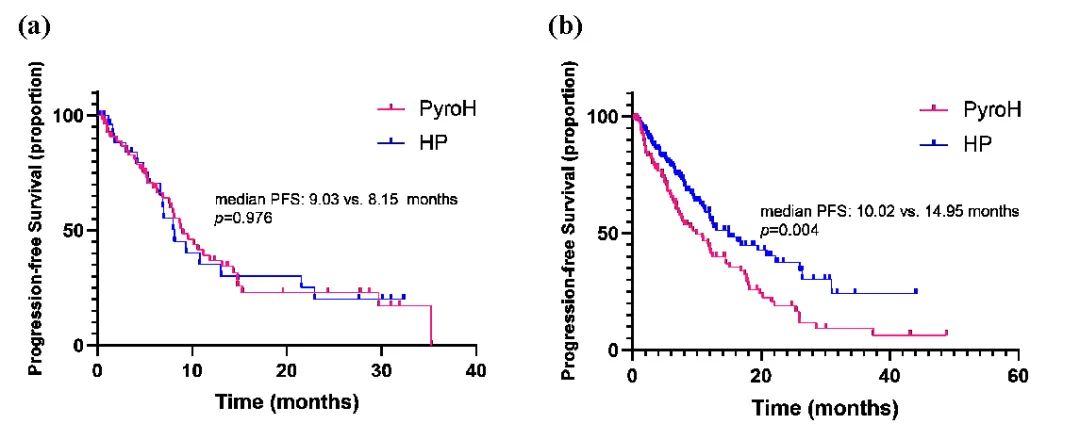 在晚期一线治疗中,HP疗效在数值上更好(中位PFS 22.90月vs 14.46月,P=0.057),而二线以上的晚期解救治疗中,PyroH和HP组之间的PFS没有显著差异(中位PFS 8.67 vs.7.92个月,P=0.286)。