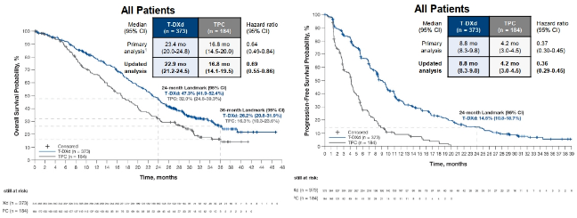 2023年ESMO[4]更新的更长时间的随访结果显示,中位随访32.0个月的结果与首次研究一致,在总人群中,T-DXd组和TPC组的mOS为22.9个月vs 16.8个月(HR=0.69);mPFS为8.8个月vs4.2个月(HR=0.36),2年OS率为47.3%vs 32.0%;3年OS率为26.2%vs 16.3%。提示了在HER2低表达晚期乳腺癌患者中,T-DXd比TPC具有临床意义的持久改善,展现了对HER2低表达乳腺癌的治疗潜力。