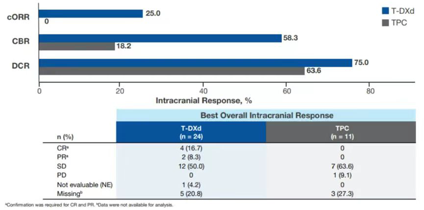 盲法独立中心审查委员会(BICR)评估的T-DXd组中位中枢神经无进展生存时间(CNS-PFS)达到9.7个月,mOS为16.7个月,与T-DXd治疗HER2低表达mBC患者的总体疗效一致[6]。再次证实了T-DXd对伴脑转移HER2阳性以及HER2低表达患者的疗效。