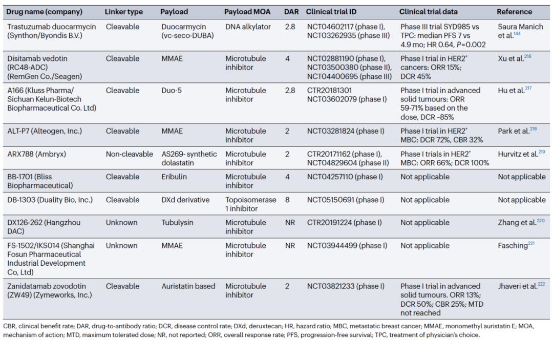 肿瘤不断变化的状态及其对现有疗法的突出逃逸能力表明,需要在现有和/或新平台上继续开发新的治疗方法,并进一步发现耐药肿瘤的新缺陷。目前已经探索了靶向替代HER2结构域或其他HER家族成员的抗体,期望实现对HER2的更完全阻断并抑制对下游信号通路的影响。携带不同有效载荷以避免对现有疗法产生交叉耐药或携带可抵消脱靶毒性的新型连接体的新型ADC也在积极探索中。