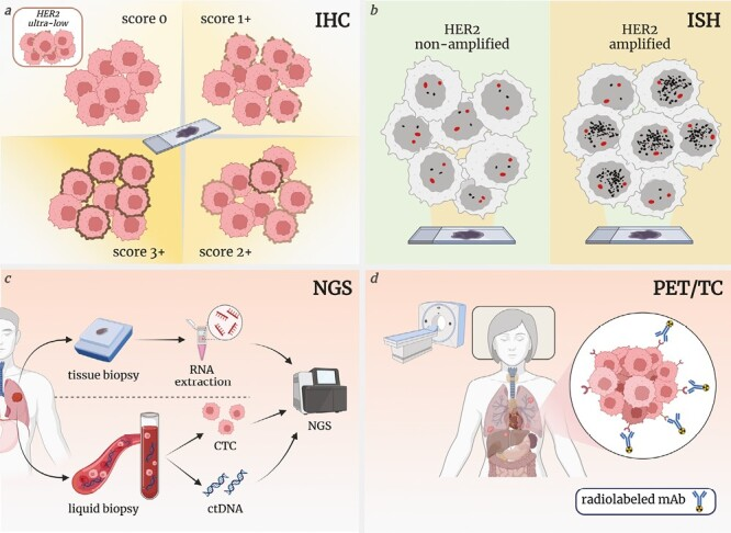 研究发现,HER2表达在乳腺癌中呈现连续性,而非简单的二元结果(阴性或阳性),因此,对于HER2表达多样性的评估与判断至关重要。现有的免疫组化(IHC)和原位杂交(ISH)等评估方法对于HER2低表达与HER2零表达的区分能力有限[10,11],因此需要需求其他方案。而新兴的定量分析方法,如检测ERBB2 mRNA,可能有助于更准确地确定HER2状态[12]。此外,HER2存在空间和时间异质性,并且会随着肿瘤发展和耐药发生动态变化,需要重新检测。分子成像技术能够全面了解HER2在所有转移部位的分布,如HER2正电子发射断层扫描(PET/CT),从而辅助组织病理学评估[13]。此外,循环肿瘤细胞和循环肿瘤DNA分析也成为肿瘤反应监测和ADC治疗选择的有力工具[14]。这些新手段为HER2定量和动态评估提供了更多可能性。
