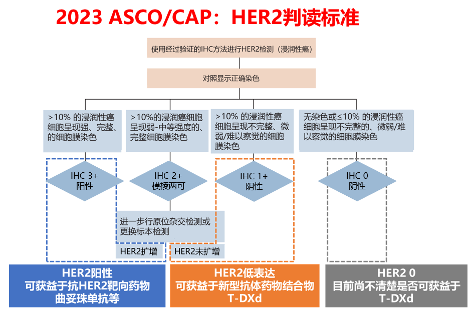 肿瘤领域的治疗和检测手段从来都是相辅相成的。乳腺癌领域HER2的发现和应用,成为了改善HER2亚型患者预后至关重要的一步,而HER2检测和抗HER2治疗相互配合,为HER2+乳腺癌患者的抗HER2治疗筛选了获益的患者。而ADC药物诞生以来,抗HER2治疗的面貌已经发生了重大的改变,HER2低表达人群约占整体乳腺癌人群的50%,传统的HER2二元分类下其没有相应的抗HER2治疗方案,DESTINY-Breast04是一项全球多中心、随机、开放性的Ⅲ期试验,对比T-DXd与医生选择的化疗方案,在既往接受过1-2线化疗的HER2低表达晚期乳腺癌患者中的疗效及安全性。结果显示,无论患者HR状态,PFS和OS都取得了阳性结果。此外,在各组人群中,ORR也都达到了50%以上,与对照化疗相比获益显著。该研究的安全性数据也显示,3级以上不良事件(AE)发生率T-DXd组低于TPC组。该研究领域的聚光灯再次聚焦在HER2病理判读领域。2023年6月7日《Journal of Clinical Oncology》发表了ASCO-CAP对于HER2的检测的指南更新版。基于DESTINY-Breast04研究,入组患者是没有HER2低表达(IHC 1+或IHC 2+/原位杂交(ISH)未扩增的情况,与其医生选择的化疗相比,使用T-DXd治疗的患者生存率显著提高。指南在考虑到研究并未入组IHC结果为0的患者。研究入组仍是在现有的HER2判读标准下进行,确定了目前HER2判读的流程仍然在新的治疗环境下适用。[7]