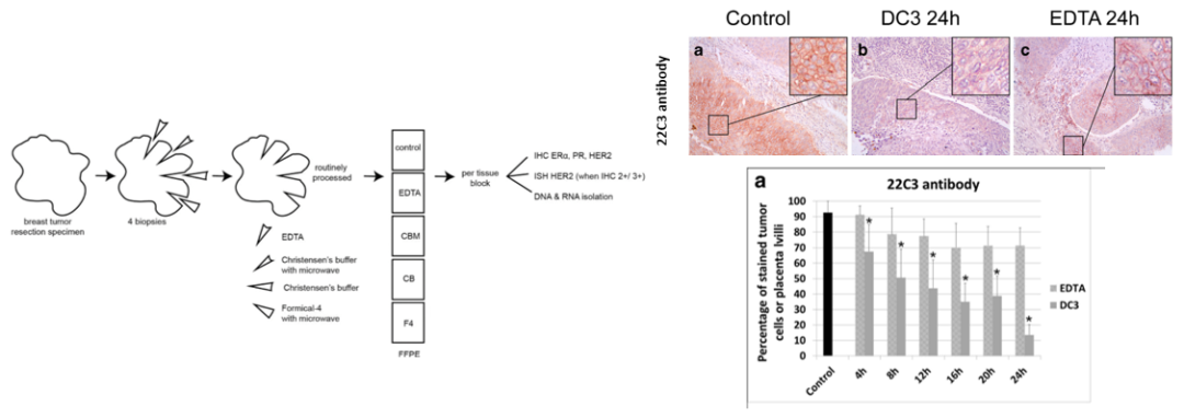 对于在乳腺癌的疾病进程中,原发灶和转移灶会发生一定的改变,对于PD-L1检测的标本选择也存在挑战。对于术后复发患者,优先建议对复发和(或)转移病灶进行活检后检测,若无法获取复发灶或转移灶标本,可使用手术切除标本。当同时获得原发灶及转移灶标本时,推荐均进行PD-L1检测,并分别报告检测结果。而对于一些特殊的转移部位,如脱钙后骨转移标本对PD-L1检测也存在一定程度的影响。[10-12]病理科常用的酸性脱钙液常为硝酸和盐酸类,其破坏核酸,对分子检测有影响,对免疫组化检测也有一定影响。而EDTA脱钙液:对FISH以及DNA/RNA检测的影响较小。EDTA-福尔马林结合了脱钙和固定,推荐骨转移标本脱钙前要经过充分固定,至少要在福尔马林液中固定1h,然后再放入EDTA脱钙。固定时间与组织大小、厚度、质地相关,但需要在6-72h的时间范围内。(见图6)[13]